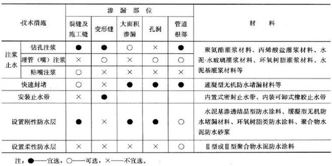 “ 2 慢渗或渗漏水点不明显的部位,将表面擦干后均匀撒一层干水泥粉,出现湿渍处,可确定为渗漏水部位; 3 外墙、顶板、底板裂缝部位,无明显渗漏时,通过做粉笔标志的方式检查渗漏开展情况; 1)注浆止水时,宜根据渗漏量、可灌性及现场环境等条件选择聚氨酯、丙烯酸盐、水泥-水玻璃或水泥基灌浆材料,并宜通过现场配合比试验确定...