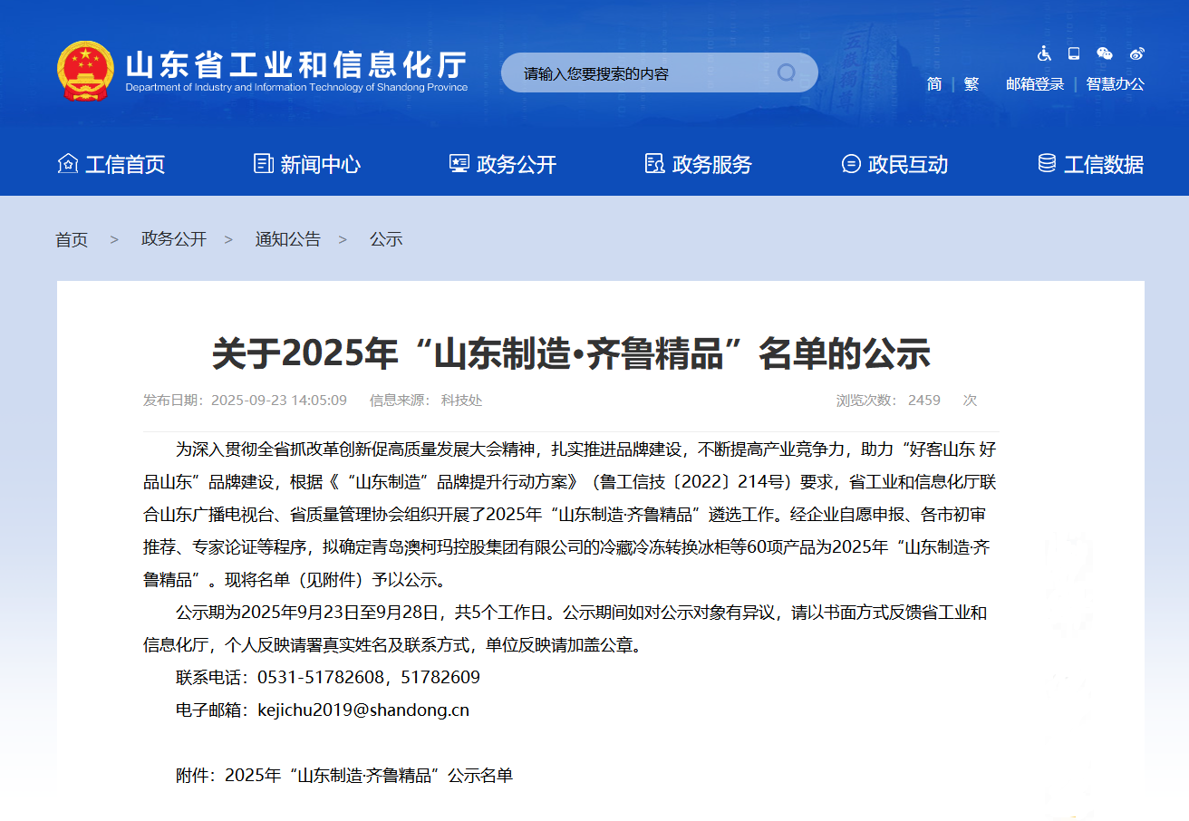 “ 9月23日,山东省工业和信息化厅官网对外发布了《关于2025年“山东制造齐鲁精品”名单的公示》,青岛澳柯玛的冷藏冷冻转换冰柜等60项产品入围公示名单。 这份经过企业申报、各市初审、专家论证的榜单,涵盖装备类、新材料类、信息技术类、纺织类、轻工类、医药类、食品类等七大类,是山东制造精品的一次集中亮相,也为“好客山东...