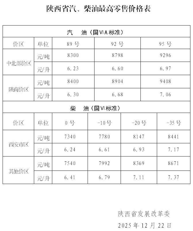 “ 我国成品油价格每10个工作日调整一次。陕西省油价标准有陕西省发展和改革委发布,以下是最新消息。 根据《石油价格管理办法》和国家发展改革委公布的国内成品油价格调整信息,现将我省汽、柴油最高零售价格公布如下,自2026年1月20日24时起执行。 国家发展改革委门户网站公布自2026年1月20日24时起上调国内成品油...